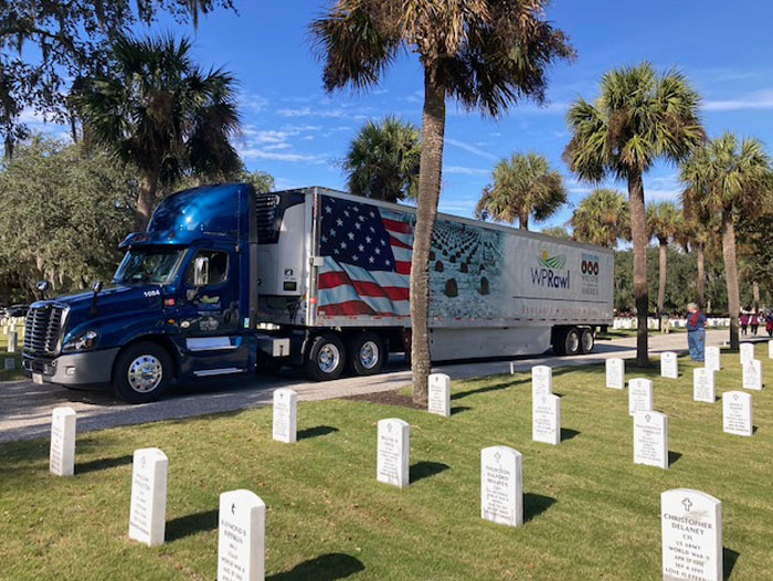 WP Rawl donates the use of their trucks, trailers, fuel and drivers to pick up loads of hand-made wreaths in Columbia Falls, Maine to be delivered to national cemeteries in their home state of South Carolina for the annual wreath laying ceremonies. A dedicated team of WP Rawl drivers who are all military veterans picked up and deliver these loads. The company’s trucks are easily identified as Wreaths Across America carriers with two beautifully wrapped trailers with graphics in support of the cause.