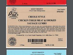 - 12-lb. ready-to-eat frozen packages containing “Phil’s OYSTER BAR & SEAFOOD RESTAURANT CREOLE STYLE CHICKEN THIGH MEAT & SMOKED SAUSAGE GUMBO,” and “Item Number 494103,” and Batch # 01018, 03718, 13518, 23318, 33217, 35517, 36117.