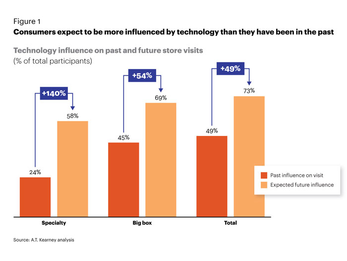 Ultimately, however, retailers should see in-store technology as a means to generate incremental growth. Survey respondents clearly agreed: nearly 50 percent of consumers surveyed expect their shopping choices to be more influenced by technology in the future. Notes Greg Portell, global consumer and retail practice lead, “This finding suggests that retailers still have the opportunity to address and meet consumer expectations by bridging the awareness/experience gap.” The only question now is not if or when, but how — which technologies should retailers deploy, and how much should they invest in them. The findings of A.T. Kearney’s 2019 Consumer Retail Technology Surveyhelps frame solutions to these questions, moving toward an actionable game-plan for retailers.