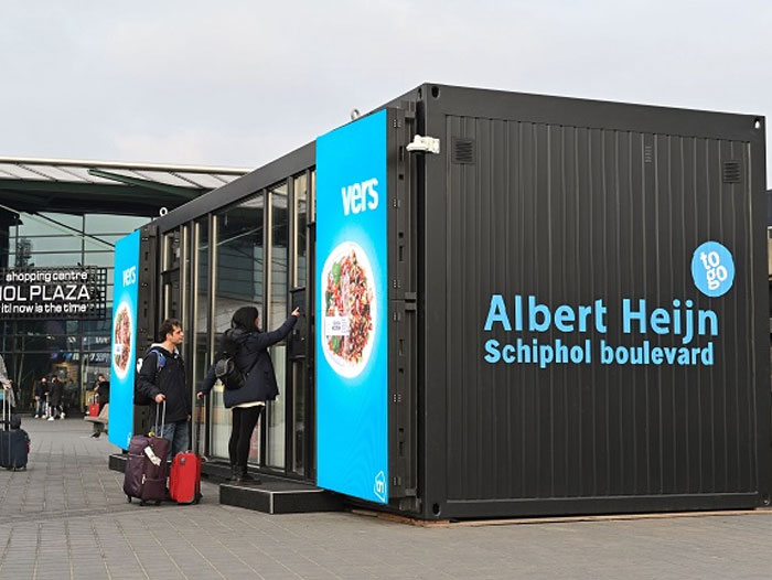 The small-footprint, portable digital store now sits on the Jan Dellaert Square in front of Schiphol Plaza, after being transported on the back of a trailer truck from its initial test location at Albert Heijn’s headquarters in Zaandam (video) where it has operated since September.