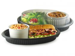 The new 11” x 8” black, oval platter was designed with a locator ring in the bottom to hold a standard 8 ounce paper food container. This popular serving size is used for chili, soups, oatmeal, grits, mac & cheese, and many other items that often accompany a main dish, sandwich or salad.  It is no longer necessary to lid both the 8 ounce side and the main course.    Simply place the paper container into the platter and add the new Embraceable dome lid with the ring formed into the top to cover the paper container and seal the platter; one lid doing double duty!