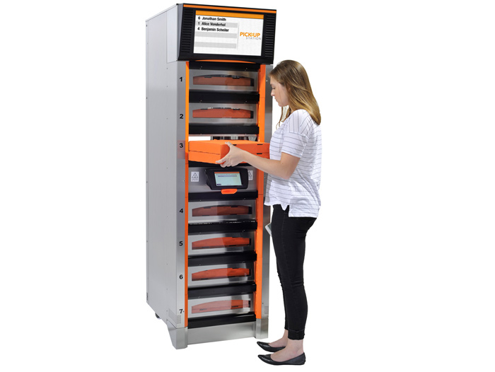 The AXCESS 2000.H is a heated pick-up station with a breakthrough, flow-through design, making it quicker and easier for employees to load. As soon as employees place orders inside the device, the customer is notified by text or email and given a pick-up code.