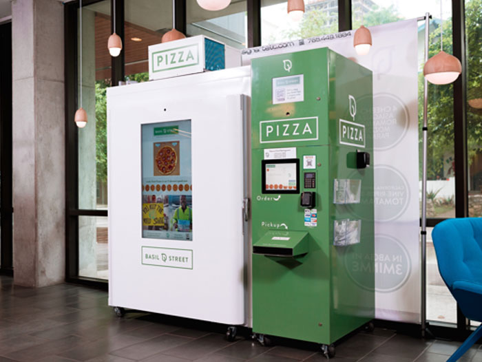 Keeping quality and convenience as forefront values, Basil Street’s kiosks feature three 10-inch Italian style, thin-crust pizza offerings: four-cheese, pepperoni, and a “Pizza of the Month,” selling between $6.50 – $14.95. All of Basil Street’s pizzas are made with the freshest ingredients and then flash-frozen to preserve the flavor and freshness before being cooked-to-order in about three minutes. The cooking process utilizes their patented three-element non-microwave speed oven. The combination of the revolutionary oven technology and pizza quality creates a finished product that rivals an elevated pizzeria. Basil Street has figured out how to deliver a brick-oven pizza experience in a fraction of the time.