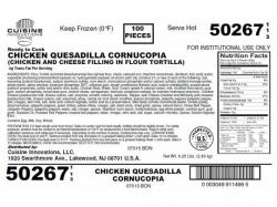 - Various weight bulk packages of “CUISINE INNOVATIONS CHICKEN QUESADILLA CORNUCOPIA (CHICKEN AND CHEESE FILLING IN FLOUR TORTILLA)” with production dates of 7/3/14, 10/14/14 and 10/15/14.