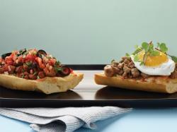 - French Bread Pizza with Seasoned Turkey Crumbles: One slice combines the breakfast sausage crumbles with egg, cilantro and microgreens, while the other is topped with the chorizo crumbles, olives and pico de gallo—mix and match toppings to explore more taste combinations