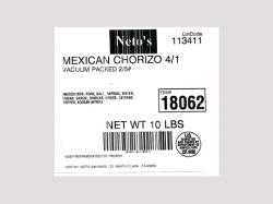 - 5-lb. vacuum packs of “NETO’S MEXICAN CHORIZO 4/1.”