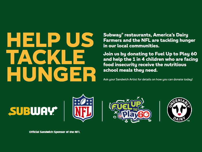 First, the chain launched the “Tackle Hunger” endeavor through its Subway Cares program. Subway Cares allows customers to add to their purchase for local causes. The franchises will use these donations for GENYOUth’s fund to provide school meals and feeding efforts from October through Nov. 30. Nationwide in-store signage features America’s Dairy Farmers, Fuel Up to Play 60 and Undeniably Dairy.