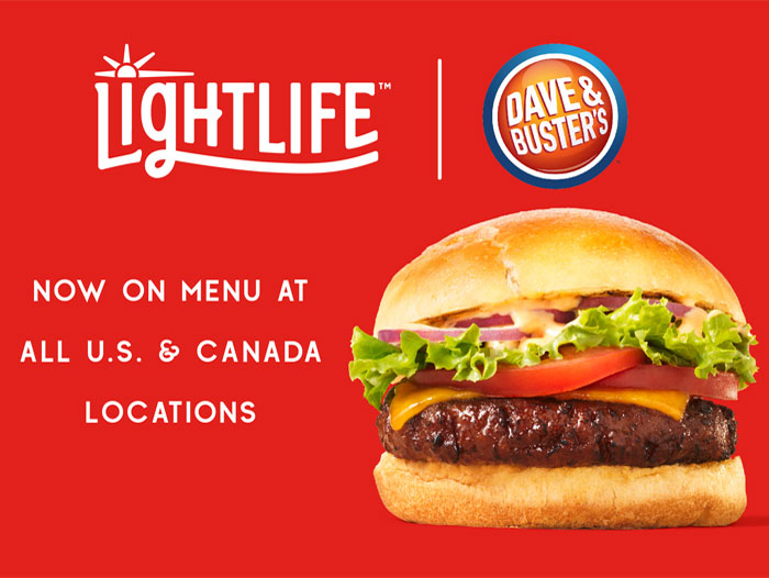 The Lightlife® Burger will replace Impossible Burger on Dave & Busters’ menu. “We’ve upgraded to Lightlife to keep up with the demand for plant-based foods,” says Dave & Buster’s Art Carl, VP of Culinary & Beverage. “We strive to be our customers’ first choice for fun, crave-able food, and Lightlife helps us do just that by giving our guests an innovative and incredibly delicious plant-based burger.”