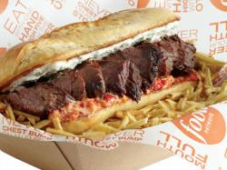 The Food Network signature brisket sandwich features porter-braised beef brisket topped with cheddar cheese, whole grain mustard and fried onions on a pretzel roll. Regional versions of the sandwich are also available at specific stadiums: the New Jersey/New York sandwich is topped with pepperoncini and smoked mozzarella; the St Louis features provel cheese and Red Hot Riplets; the Cleveland sandwich is topped with potato pancake, caramelized onion, horseradish sour cream and stadium mustard; the Buffalo is slathered in Frank's hot sauce, blue cheese and sliced celery; and the Chicago sandwich is topped with Giardiniera, sharp provolone and celery-seed and sport pepper mayonnaise.