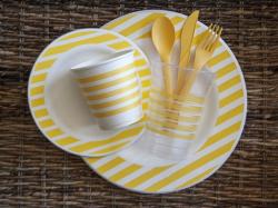 The new line is made from 100 percent renewable resources. The plates, made from sugarcane, are sturdy and won't bend, even while holding a pile of food. And the cups and cutlery are made with Ingeo™, a naturally advanced plant-based plastic. Everything is certified compostable by the Biodegradable Products Institute (BPI).