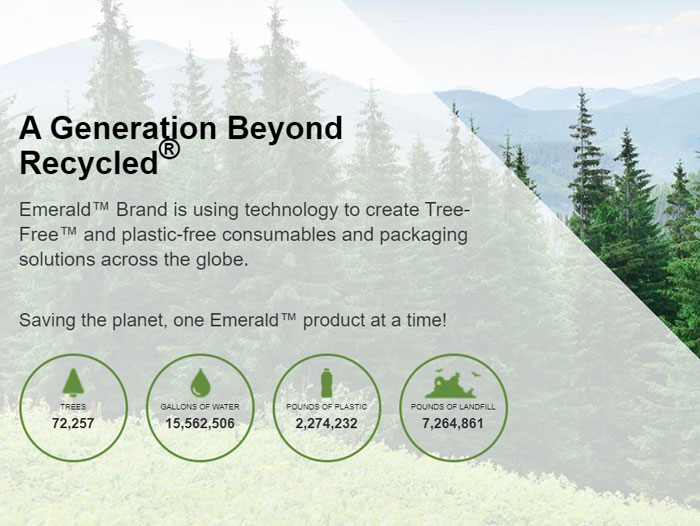 Innovators in material technology since 1997, Emerald Brand is committed to educating the entire disposable supply chain, the benefits in using Tree-Free™, sustainable and rapidly renewable solutions. Emerald’s innovations in Tree-Free™ technology and petroleum-free plastics are revolutionizing packaging and disposables worldwide. Emerald’s growing suite of 300+ sustainable finished products offers the workplace a healthier and more sustainable environment.