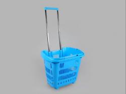 Shoppers can either use the arm handle and carry the basket or use the extendable handle and pull it behind them. Extendable handle encourages ergonomic posture for a comfortable and smooth shopping experience. Basket features 40% more capacity than traditional hand-held baskets and is stackable for ease of storage. Styles are available in two or four wheel variation. Multiple sizes and colors are also available.