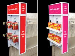 The customizable Plastic Power Wing system can be used to display merchandise with hooks on the pegboard back, or with the optional secure-fit trays/shelves. The system can also be used with or without the available header for promotional or brand signage.