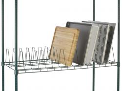 These full shelf racks are the perfect product for holding most any kind of pan, tray or cutting board for more efficient drying and convenient storage. These shelves eliminate the need to purchase modular and truss combination kits. The open construction of the green epoxy coated wire shelves minimizes the amount of surface contact with stored items and promotes greater air circulation to speed up the drying process. Two styles available: 15 slots to accommodate deeper bakeware and thicker cutting boards and 35 slots for standard sheet pans, shallow pans, etc.