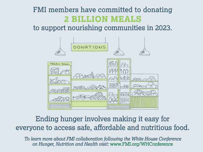 As part of the pledges and announcements made surrounding the White House Conference and the National Strategy, FMI’s members committed to achieving ambitious goals that address food and nutrition insecurity as well as support the health and well-being of American shoppers, including donating at least two billion meals in 2023 to food banks and other non-profits that feed people in under-resourced areas and sharing evidence-based messages and educational tools that align with the Dietary Guidelines for Americans (DGAs) to reach at least 100 million consumers in 2023.