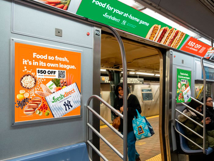 - 4-Train Subway Takeover: For the month of April, fans travelling to Yankee Stadium via the 4 train – along with thousands of others who commute between The Bronx and Brooklyn – will see FreshDirect and Yankees-branded exterior train wraps covering five cars on the Subway line. Promotional offers will be placed inside each car, and fans can scan the QR code to receive a special FreshDirect discount.