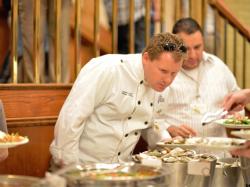 After Nagel spoke, Frugé took the podium once again, introducing his staff and acknowledging their hard work. He invited School of Fish “students” to enjoy the buffet, which featured all of the fish discussed over the course of the evening, along with julienned vegetables, salad, and succotash. Four different varieties of oysters on the half shell were served (Mayflower, Pemaquid, St. Simon, and Wellfleets), allowing guests to taste the subtle differences between them. Seared striped bass was dressed in a red curry coconut cream and Achiote grouper was paired with a light green apple sauce. A baked United Kingdom Salmon was served, whole, with creamy smoked tomato butter.