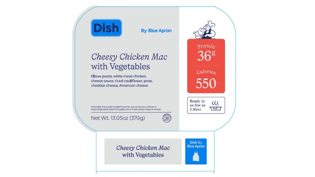 • Sold by Blue Apron: 13.05-oz. plastic tray packages labeled “DISH by Blue Apron Cheesy Chicken Mac with Vegetables” with lot codes 25240 and 25247. The product bears establishment number “P-3081.”