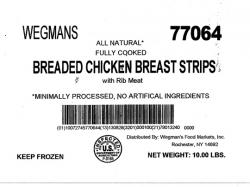 - Two 5-lb. bags in a 10-lb. box of “Wegmans Fully Cooked Breaded Chicken Breast Strips” with the product code “77064” printed on the box.