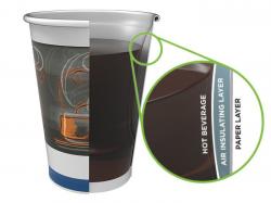 The Insulair Hot Cup is a single-wall paper cup with an interior lining made of a low-density polyethylene film. When a hot liquid is poured into the cup, a thin heat-activated air pocket expands within the cup's lining, replacing the need for an external sleeve. The air pocket adjusts to the temperature of the beverage, meaning the hotter the liquid, the greater the air pocket. The Inuslair Hot Cup is available in 12-, 16-, and 20-ounces, with actual ounces dependent on the heat of the liquid and the size of the air pocket.