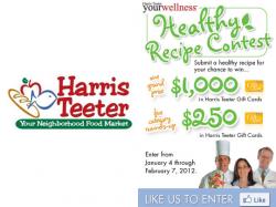 Charlotte, NC – Harris Teeter’s yourwellness team is encouraging shoppers to share their favorite healthy recipes during the company’s Healthy Recipe contest now through Feb. 7, 2012 for a chance to win a grand prize of $1,000 in Harris Teeter gift cards or one of five runners-up prizes of $250 in Harris Teeter gift cards.