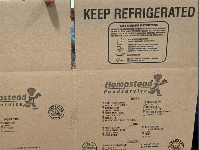 - 10-41 lb. carboard boxes containing the product in clear plastic bags with “Hempstead Foodservice” on the box and “PORK CHOPS” marked from the list on the side of the box.