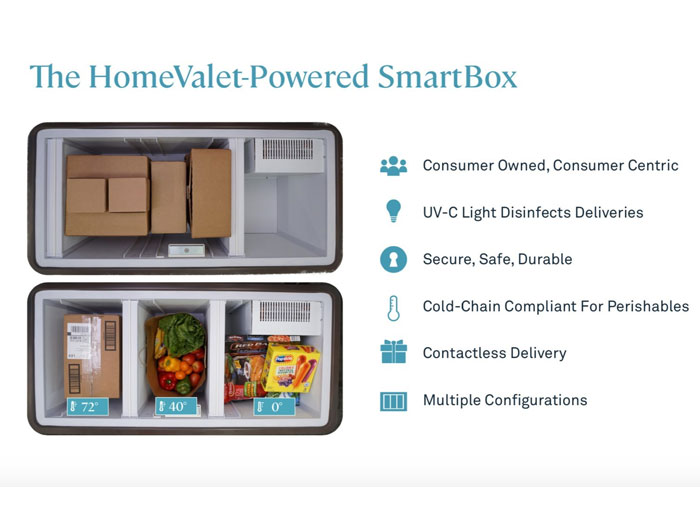 HomeValet’s patented SaaS platform enables automated delivery of packages, groceries, and other goods directly to a secure, temperature-controlled Smart Box placed outside of consumers’ homes. The Smart Box is equipped with the capability to disinfect exposed surfaces of delivered items as well as the interior of the Smart Box between deliveries using UVC light.