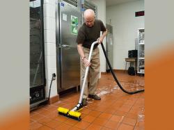 The OmniFlex system dispenses fresh cleaning solution to floors. A brush head is used as needed to loosen and remove soils and contaminants, which are then thoroughly removed using the system’s wet/dry vacuum.