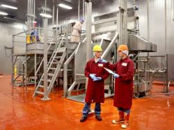 A custom-built spiral freezer takes food from a cooking temperature of 180 degrees to zero in 60 minutes, sending the cooked product up a half-mile-long conveyor belt in a very tall freezer so that all sides of the product are exposed constantly to a minus-50 temperature.