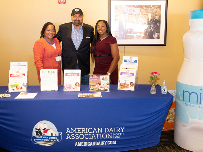 Franco & Staff: Former Pittsburgh Steeler Franco Harris visits the American Dairy Association North East booth at the Pittsburgh School Food Service Summit on Friday, April 22, at Heinz Field.