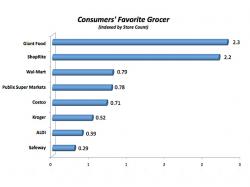 When consumers were asked which grocery store captures the most of their dollars, eight grocers earned more than 2% of the vote, with Walmart, Kroger and Publix Super Markets landing in the top three spots. However, since grocery retailers have thousands of locations and others have a fraction of that, Market Force indexed the results by store count in order to get a more accurate representation of the results. This analysis moved Giant Food to the No. 1 position, closely followed by ShopRite, and then Walmart, Publix, Costco, Kroger, ALDI and Safeway. See Graph 1. This is a slight shift from 2011, when Kroger and ShopRite held the top two spots.