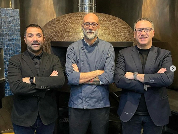 Co-owners of Marra Forni Enzo Marra, left, COO, and Francesco Marra, right, CEO, with Giulio Adriani, center, their new CPO, in their Culinary Center in Beltsville, Maryland.