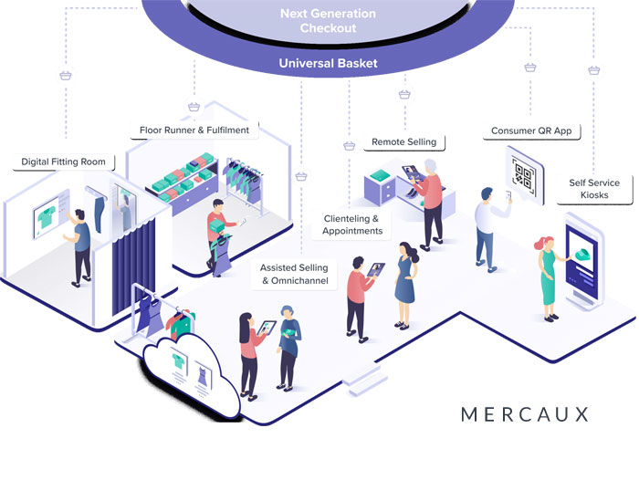 Mercaux’s Composable Platform future-proofs stores. The 3-layers comprise of In-Store Experience, Universal Basket and Next Generation Checkout. The Experience layer redefines how customers interact with the physical store, through assisted selling and self-service solutions. Universal Baskets are created from these solutions that follow the customer wherever they continue their omnichannel experience. Next-Gen Checkout allows customers to complete the transaction anywhere, using any payment.