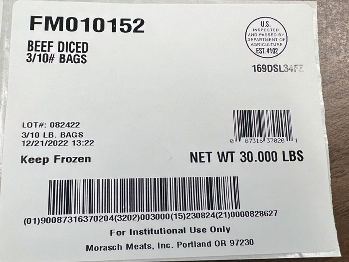 - 30-lb. box packages containing “BEEF DICED 3/10# BAGS,” with case code FM010152, LOT#: 082422 and a date of 8/24/2022 on the case label. Each case contains three 10 lb. vacuum-sealed, clear plastic bags of the diced beef products.