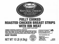 - 5 lb. bags packed 2 bags per case; product labeled “Hormel Natural Choice 100% Natural No Preservatives Fully Cooked Roasted Chicken Breast Strips with Rib Meat Natural Smoke Flavor Added” with Lot code 100416, and Case code 702113.