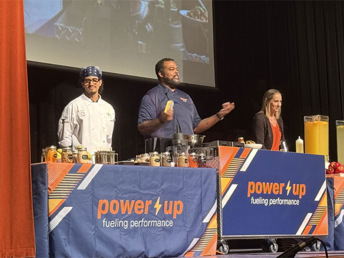 Through Power Up, students will benefit from cooking demonstrations featuring recipes designed to fuel them for any activity and can expect to enjoy performance-friendly meals in the cafeteria. These meals will include a variety of nutritious, macro-rich options for breakfast and lunch such as Breakfast Vegetable Quesadillas, Orange Crush & Granola Parfaits, Southwest Sweet Potato Grain Bowls, Protein Punch Power Packs, Buffalo Chicken Shaker Salads, and Sriracha Turkey Burgers, all crafted to support the dietary needs of active students.