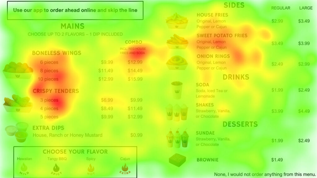 Eye-tracking heatmaps revealed guests focused on menu items and prices, not explanatory text.