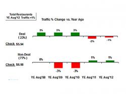 Chicago — Consumer perceived deals, like combined item specials and dollar/value menus, that enticed consumers to visit restaurants during the height of the recession no longer serve as an impetus for driving traffic growth, according to The NPD Group, a leading market research company. NPD’s foodservice market research finds that for the year ending August 2012 non-deal restaurant visits increased by +1 percent in each of the last two years while visits on-a-deal have been on the decline during this same timeframe. This is a reversal from three years ago when consumer perceived deals were up +3 percent for three years in a row and non-deal visits were trending down.