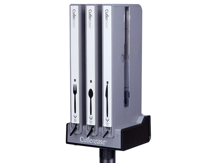 Ideal for restaurants, stadiums, colleges and hospitals, Cutlerease allows foodservice operators to mix and match utensils. For example, a cafeteria could offer a fork-knife-spoon combination with the triple base, while a frozen yogurt store could provide just spoons from a single tower. Cutlerease also can dispense compostable knives, forks and spoons from Eco-Products.