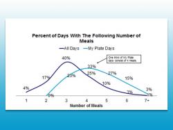 Using NPD’s National Eating Trends®(NET®) research, which has continually tracked the eating and drinking habits of U.S. consumers for over 30 years, MyPlate days were calculated based on consumers who, on the same day, achieved at least 70 percent of the daily recommended intake for dairy, fruit, grains, proteins and vegetables. For the average consumer, two percent of their days (about 7 days a year) come close to the USDA dietary guidelines; and when a MyPlate day is achieved, consumers are very likely to consume more than three meals a day.