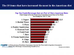 “The real ‘Foods of the Decade’ are not hummus, quinoa, nor kale, and not even Sriracha,” says Balzer. “The real foods and beverages of the decade are those that have increased the most in the American diet.”