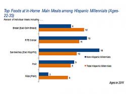 U.S. Hispanic Millennials display a preference for Hispanic dishes that reflect their heritage,NET Hispanic finds. Hispanic dishes (excluding frozen) are included in seven percent of all meals consumed by Hispanic Millennials compared to two percent of non-Hispanic Millennial meals. Sandwiches are included in 16 percent of non-Hispanic Millennial meals and 10 percent of Hispanic Millennial meals. Rice, a popular U.S. Hispanic food, is included in only 3 percent of non-Hispanic Millennial meals.