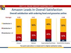Amazon shoppers give the highest overall satisfaction scores with ordering food and groceries online as compared to scores given by Walmart and Supermarkets/Food Store shoppers.