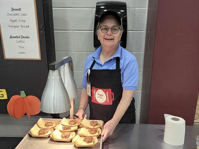 PHOTO 1: Brandywine Heights High School Head Cook Donna Kline prepares beef hamburgers for students. Kline has worked in food service at the high school for 30 years.