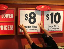 “Every pizza price slashed,” signs for the menu deals promise, with the word “slashed,” well, slashed almost in half, as if Pizza Hut were advertising the latest installment of “A Nightmare on Elm Street.”