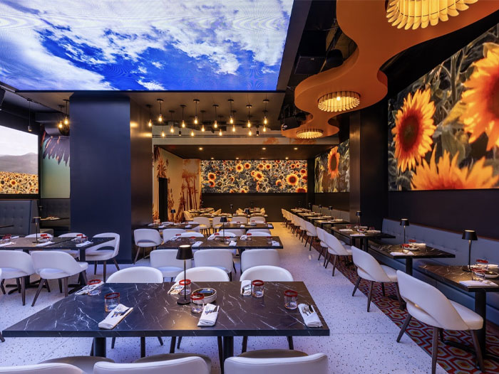 Located at 136 W. 42nd Street, the restaurant redefines Hollywood glamor beneath a 360-degree canopy of state-of-the-art, high-definition screens. Encircling the entire perimeter is an impressive array of over 692 video tiles delivering cutting-edge dining and event experiences through dynamic and interactive displays. With 8K resolution video surfaces spread across each floor, diners are transported to thematic worlds, ranging from old Hollywood glamour to futuristic landscapes, making every meal an epic journey.
