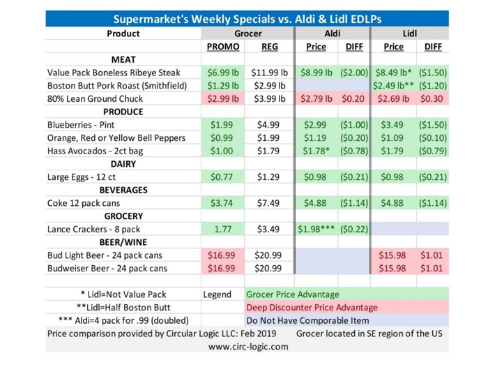 “The first step in this new strategy is to focus on a retailer’s weekly circular – it’s a secret weapon for supermarkets that’s an often-overlooked source of price advantage,” Bishop explained. Price data collected by Circular Logic, LLC showed that a supermarket’s weekly advertised prices are frequently lower than everyday prices offered by Aldi and/or Lidl. For example, based on one week in February 2019, a retailer in the Southeast had the price advantage for 8 out of 11 (72%) of its front-page features based on comparable or same items.