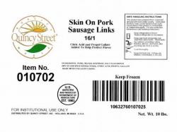- 10-lb. packages containing 1-oz. pieces of “Quincy Street Skin On Pork Sausage Links” with item number 010702.