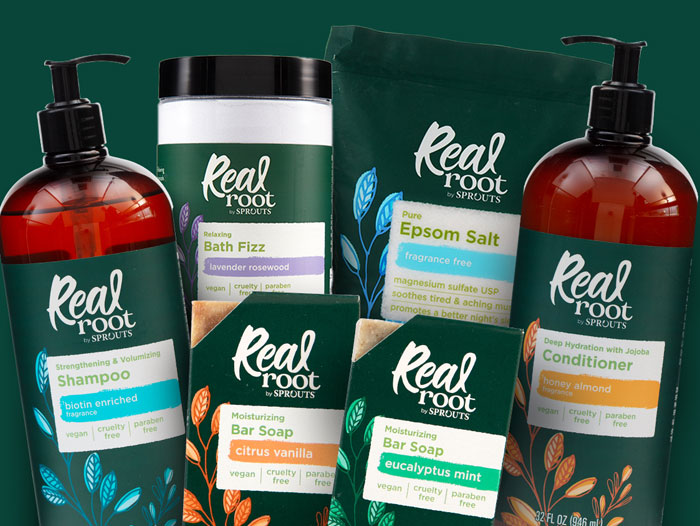 · Hair Care – Enjoy soothing and hydrating Real Root by Sprouts shampoo and conditioner. Infused with oils, the formula is designed to uplift and purify. Plus, Real Root by Sprouts’ gentle and biodegradable formulas are vegan, color safe, paraben free and never tested on animals.