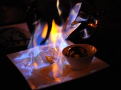 Diners watch as the plate comes toward the table, usually with some degree of sizzle. A high-proof accelerant is added. There are pyrotechnics. The flaming food is served.